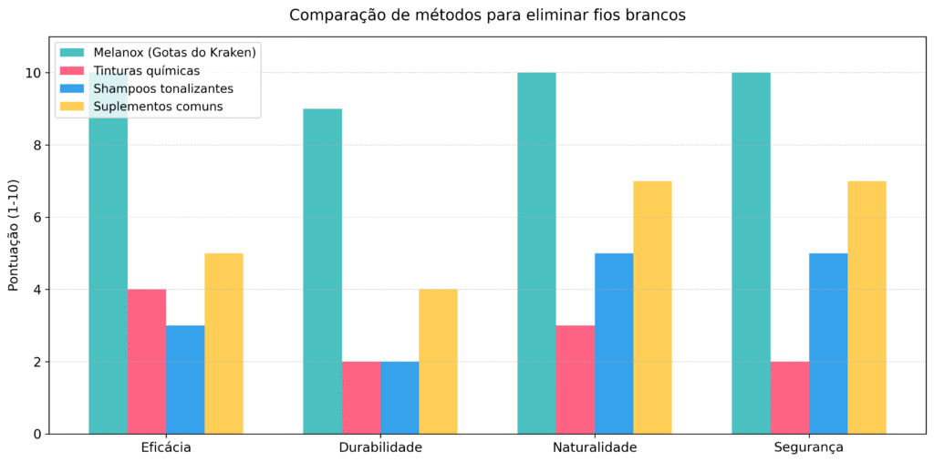 Elaboramos o gráfico visual abaixo onde avaliamos três características principais dessas formulações, sendo elas o combate aos cabelos brancos (quanto mais preenchido, maior o efeito com menos doses da suplementação); a restauração da cor natural (quanto mais preenchido, maior a velocidade de restauração em menos doses da suplementação); e por último, a prevenção de novos fios brancos (quanto mais preenchido, maior a intensidade com menos doses da suplementação).