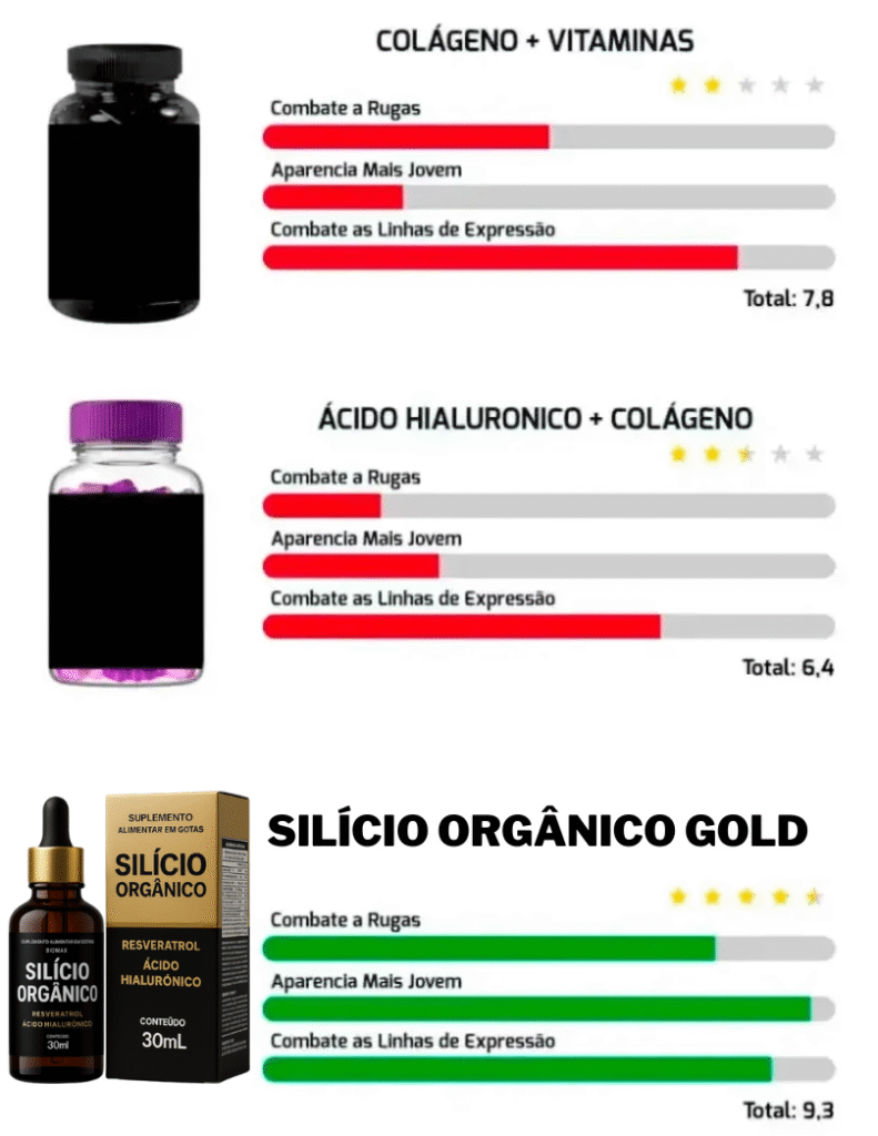 Fizemos testes em laboratório com o Silício Gold para comparar sua eficácia em relação a outros produtos para pele que estão disponíveis no mercado brasileiro. Para isso, analisamos os 15 produtos mas vendidos e verificamos que NENHUM  desses produtos contém como base o Silício Orgânico em conjunto com Ácido Pantotênico e Ácido Hialurônico. Eles apresentam apenas colágeno e ácido retinoico como ingrediente principal.